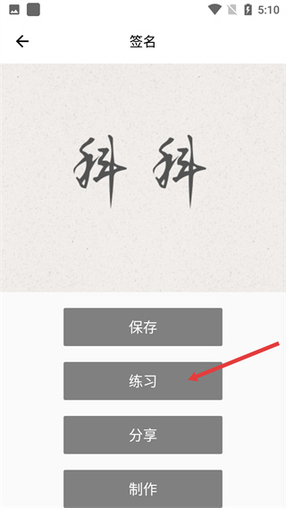 3、点击选定的签名样式进入详情页,在功能按钮中找到【练习】选项并点击,进入签名的练习界面。