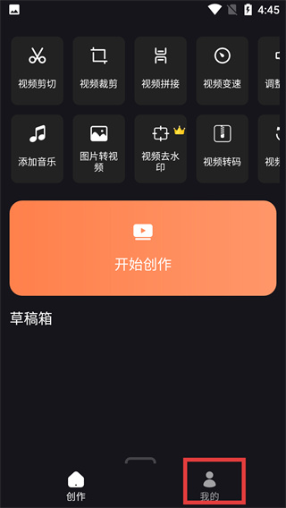1、进入视频编辑工具的【创作】界面后,点击底部的【我的】按钮,即可进入包含作品-草稿箱的个人管理页面。