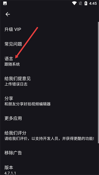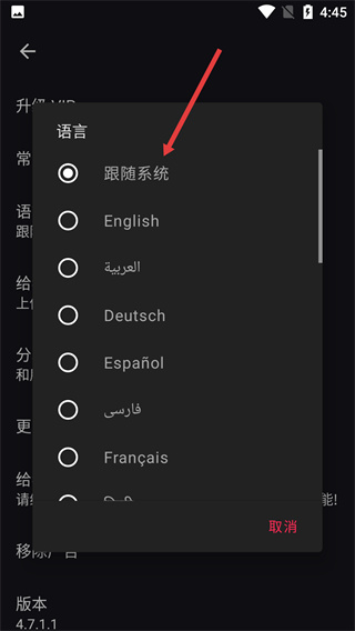 4、在弹出的【语言】选择弹窗中,可选择【跟随系统】或【English】等语言选项,完成工具显示语言的设置。