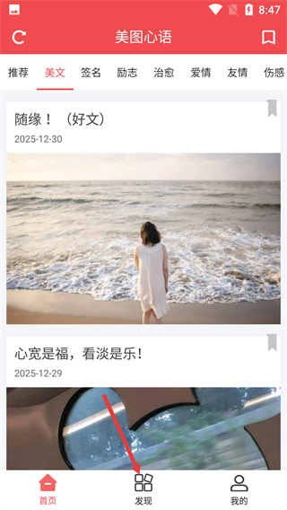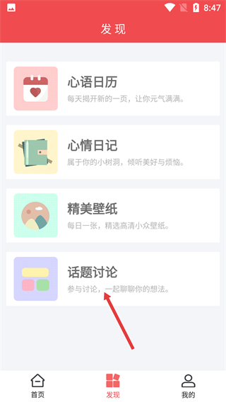1、进入【美图心语】首页,点击底部导航栏中的【发现】选项,即可进入包含多个功能入口的发现页面。