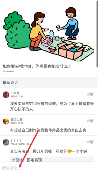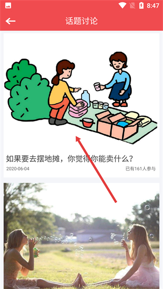 3、进入【话题讨论】页面后,选择目标话题(如摆地摊相关话题),点击即可进入该话题的详情页面。