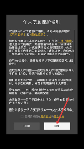 1、使用ProCCD古相机前,勾选【已阅读并同意用户协议和隐私政策】,点击【同意】按钮即可进入应用主界面。