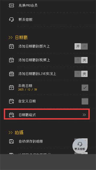 3、在设置页面的【日期戳】板块中,点击【日期戳格式】选项,进入对应的格式选择界面。