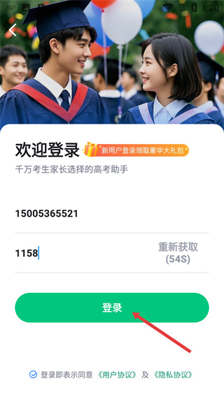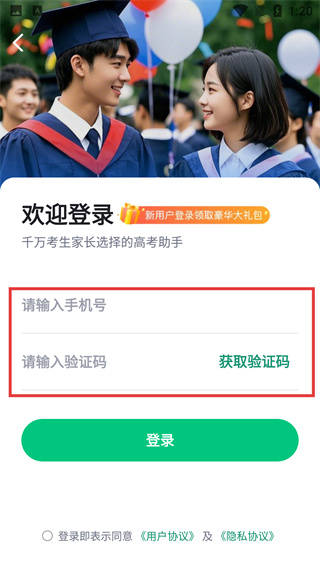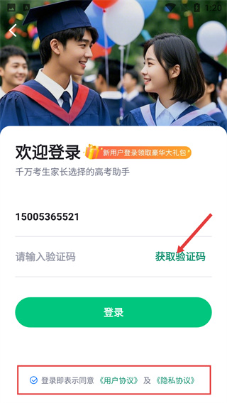 3、在输入框填写手机号后,勾选【登录即表示同意《用户协议》及《隐私协议》】,再点击【获取验证码】按钮。