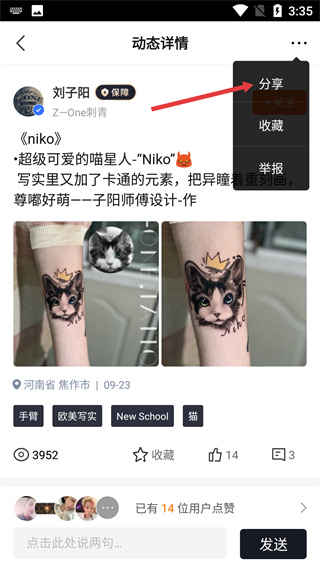 2、在纹身图案的动态详情页面,点击右上角的更多操作按钮,调出包含多项功能的操作菜单。
