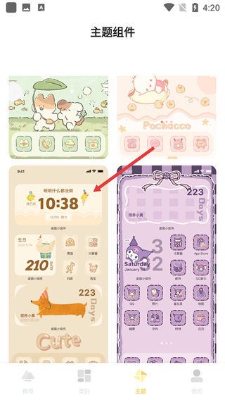 1、进入多多主题壁纸的推荐页面,点击底部【主题】选项,进入展示各类主题组件的主题组件页面。