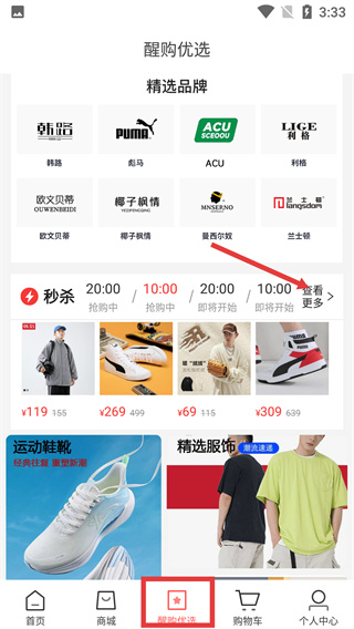 1、进入APP的醒购优选页面,点击秒杀板块右侧的【查看更多】选项,进入限时秒杀的活动页面。