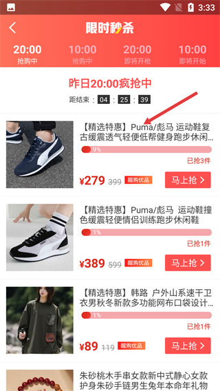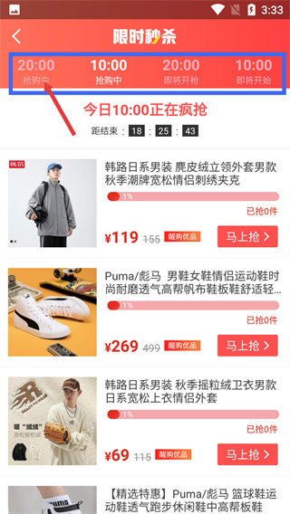 2、在限时秒杀页面,选择对应的抢购场次,切换至该场次的商品展示列表。