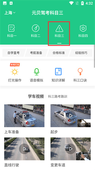 1、进入元贝驾考科目三页面,确认当前处于科目三板块,查看灯光操作等功能,找到学车视频相关板块。