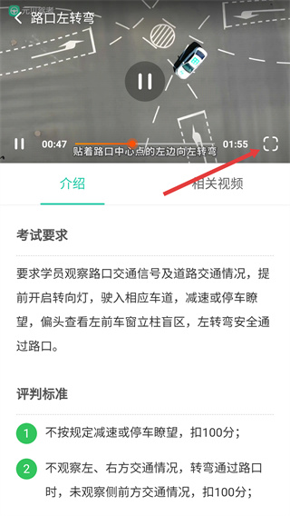4、在视频播放界面,点击全屏按钮切换至全屏模式,更清晰学习“贴着路口中心点的左边向左转弯”等操作细节。