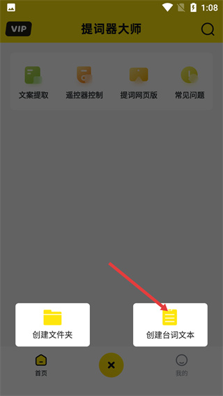 1、进入【提词器大师】首页,先了解【文案提取】、【遥控器控制】等功能,点击底部【+】按钮,准备开启内容创建操作。
