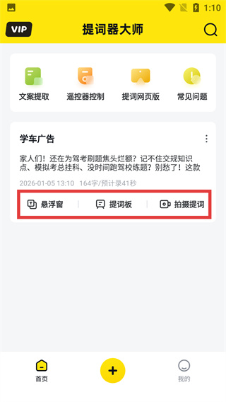 4、回到【提词器大师】首页,找到已创建的【学车广告】,选择【悬浮窗】、【提词板】等功能启用对应的提词模式。