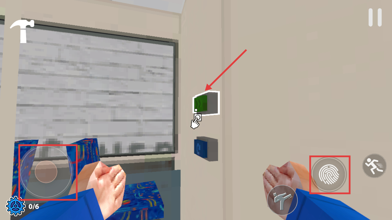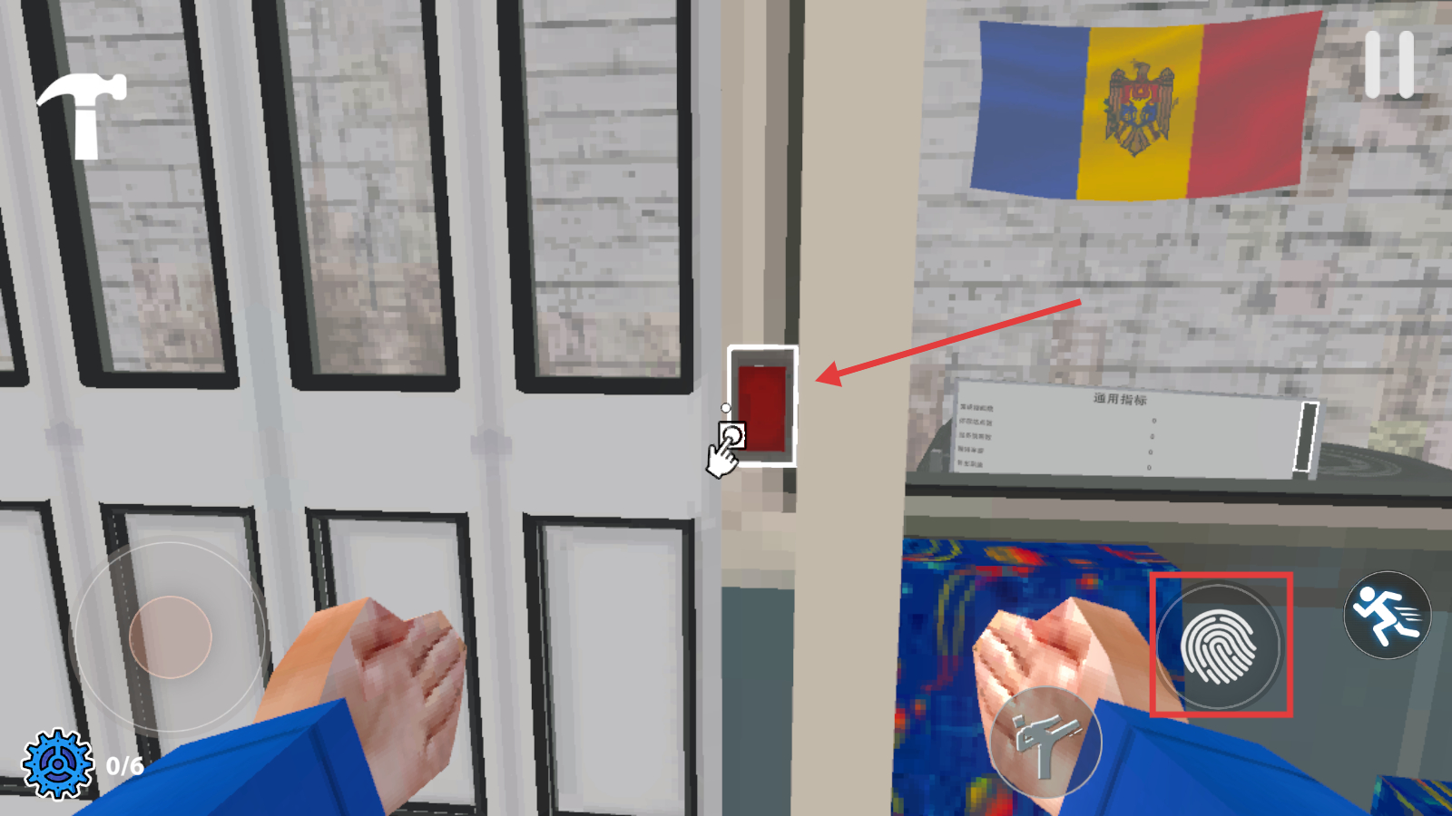 1、我们拖动左侧摇杆移动角色,靠近墙上的设备时,点击右侧指纹按键就能交互,触发设备功能啦。