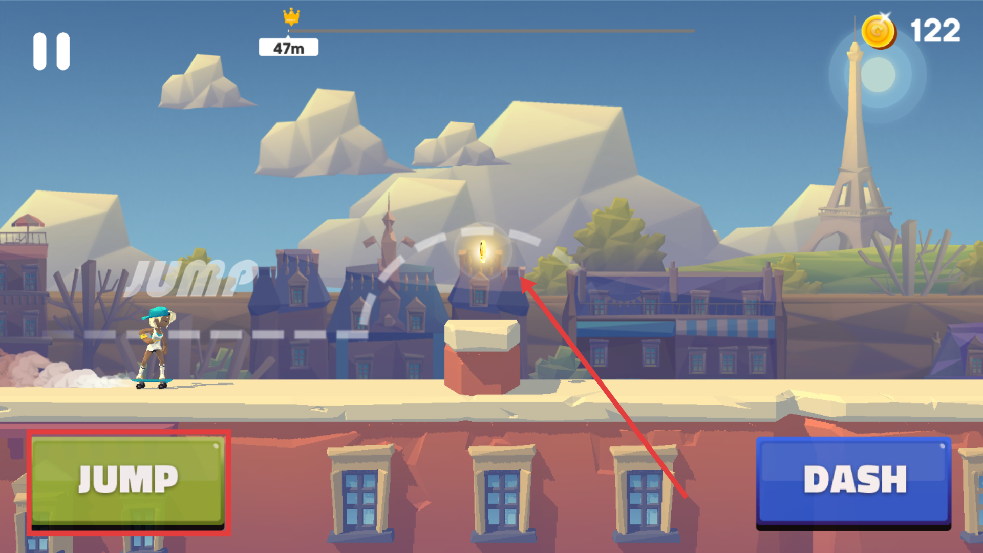 2、遇到障碍物时,提前点【JUMP】,使角色跳跃越过障碍物,同时收集金币前进。
