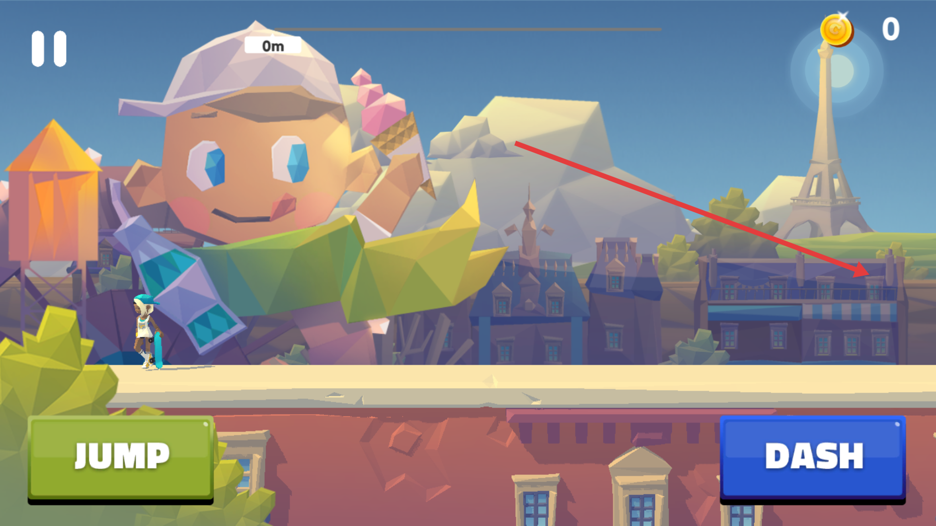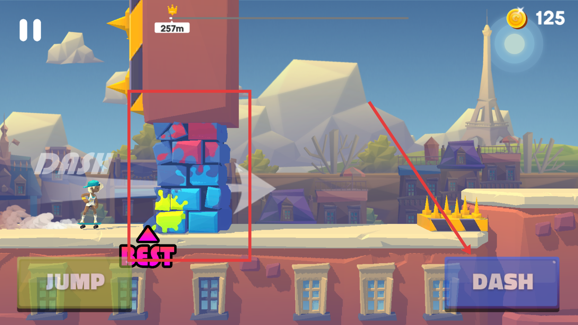4、面对彩色方块堆等大型障碍物,点击【DASH】按钮,让角色快速冲刺冲破障碍物,向更远距离前进。