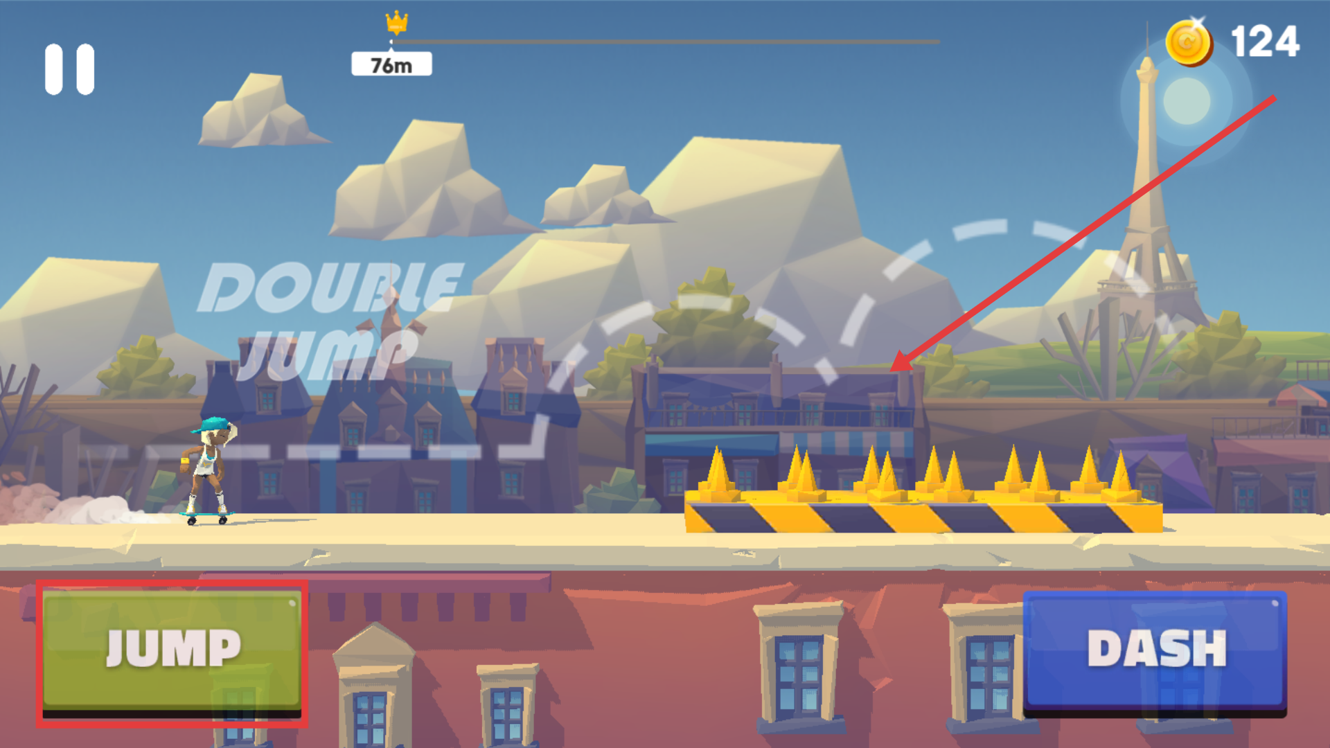 3、碰到带尖刺的危险障碍物,再次点击【JUMP】实现二段跳(DOUBLE-JUMP),避开尖刺保障安全。