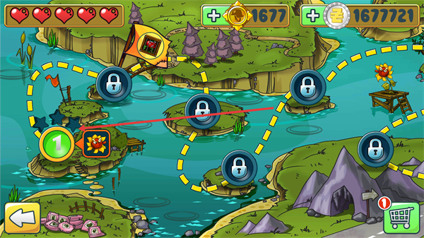 1、在地图界面,点击标有“1”的绿色圆形按钮,进入对应关卡。