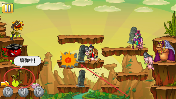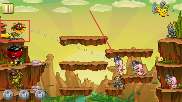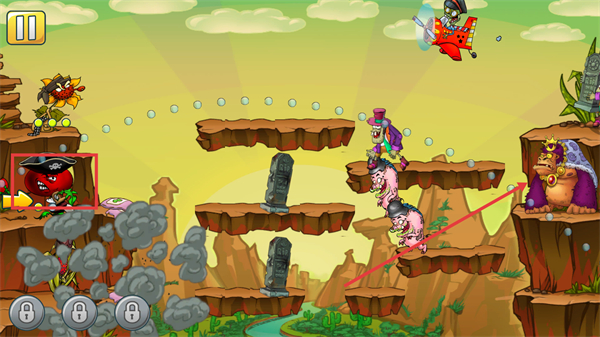 2、进入关卡后,操控左侧带海盗头巾的花朵角色,发射子弹攻击右侧的粉色猪形怪物等敌人。