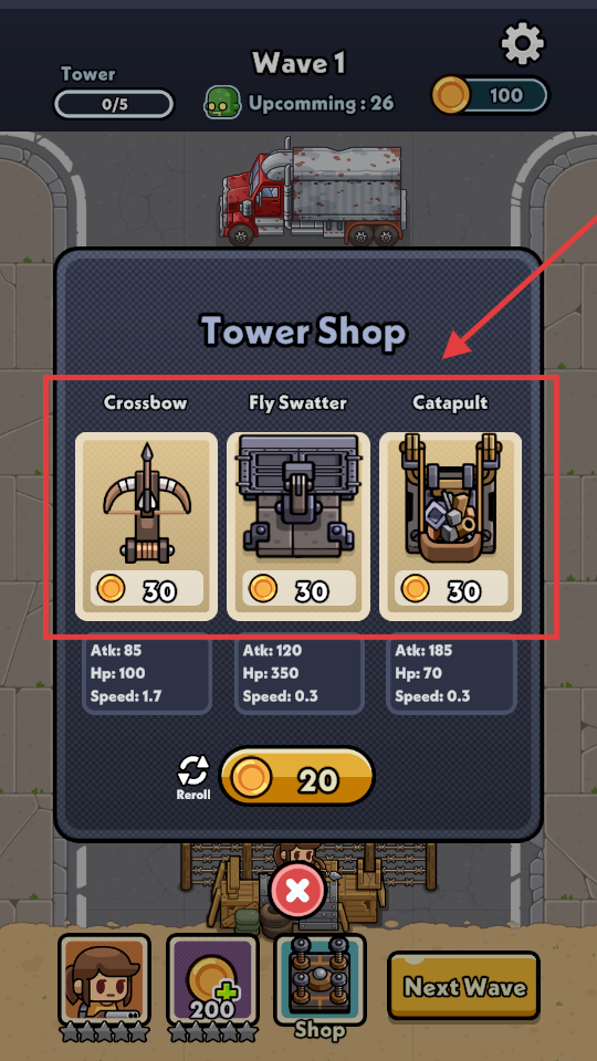 1、TowerShop中可花费30金币购买【Crossbow】【FlySwatter】【Catapult】,需根据属性择优选购布局防线。