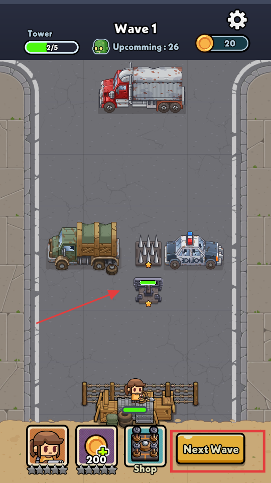 2、放置塔后,点击【NextWave】开启尸潮,已布的塔会自动攻击,需确认防御设施是否就绪。