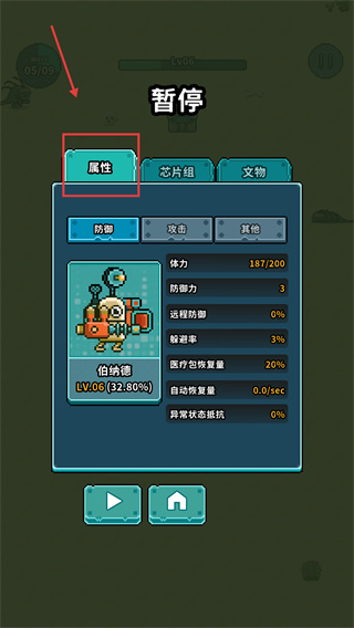 1、查看【属性】界面,了解角色防御、体力等数据,根据战斗需求调整策略,提升生存能力。