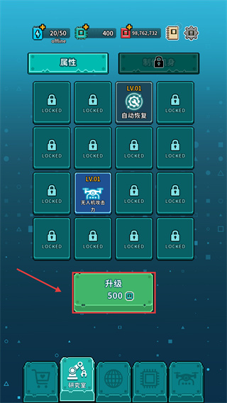 4、在研究室消耗芯片升级技能,解锁【自动恢复】【无人机攻击力】等功能,全面提升角色战力。