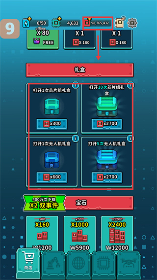 4、消耗资源打开芯片组礼盒和无人机礼盒,获取芯片和无人机,提升角色战力。