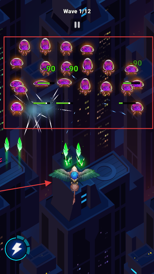 1、进入【Wave1-12】关卡后,操控角色灵活走位躲避敌人攻击,利用自动发射的绿色子弹消灭紫色怪物,观察弹道提前闪避保证安全。