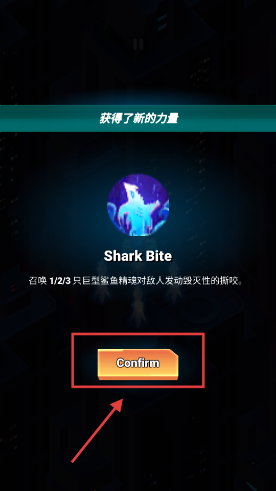 3、解锁新技能【SharkBite】后点击【Confirm】按钮激活,该技能可召唤巨型鲨鱼精魂撕咬敌人,提升战斗清敌效率。