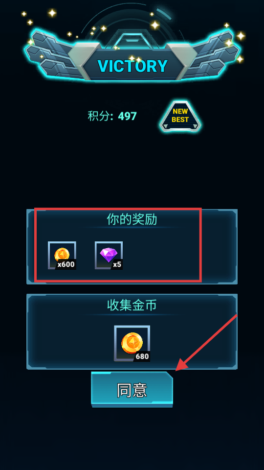 4、通关后获得【金币x600】与【钻石x5】奖励,点击收集金币按钮领额外680金币,积累资源用于后续升级。