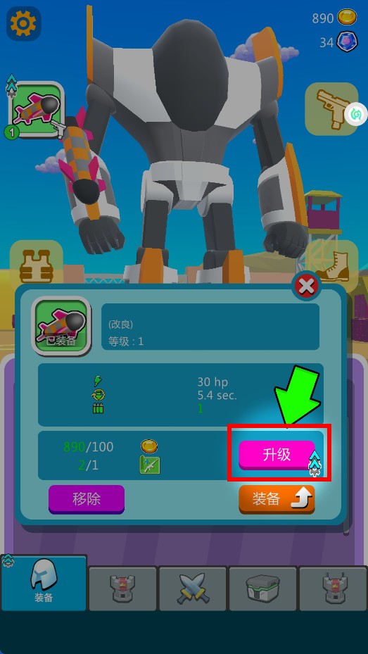 1、装备界面资源消耗满足后,点击【升级】提升武器属性,增强机甲战力,助力后续挑战。