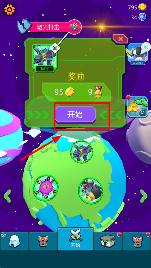 2、星球任务界面选带【激光打击】的任务,点击【开始】参战,完成得【95】金币-【9】勋章,积累资源。