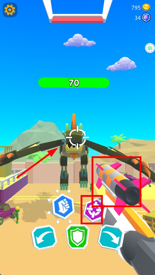 3、战斗中瞄准怪物,结合紫色技能与火箭武器,合理释放技能提升输出,高效削减怪物血量。