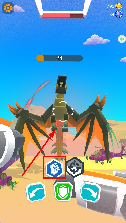 4、战斗时瞄准怪物弱点,点击拳头技能按钮,发动攻击提升伤害,快速击败怪物推进关卡。