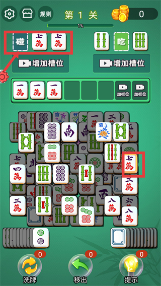 2、出现相同的【七萬】麻将,点击下方【七万】,完成碰牌,推进牌局。
