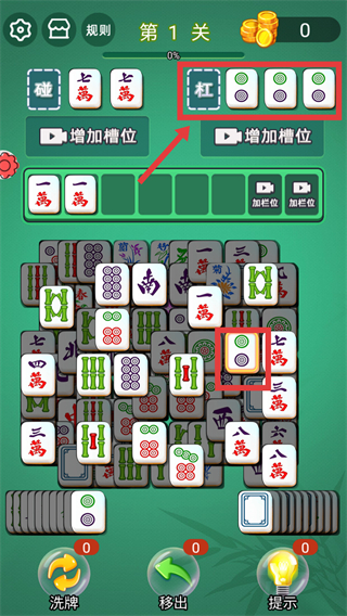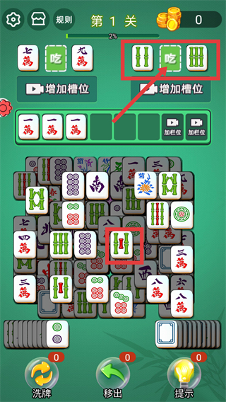 1、遇到相同的【二饼】麻将,点击下方二饼放进杠的位置,完成杠牌操作,积累分数。