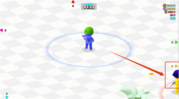 2、游戏中注意观察敌方角色动向,像图中黄色敌方角色出现时,需及时调整策略,利用自身武器进行有效攻击。