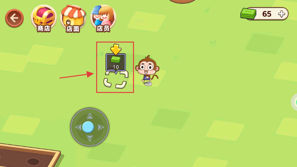 2、收集界面中的【10】资源,用移动按钮操控角色解锁【商店】-【店面】-【店员】功能提升效率。