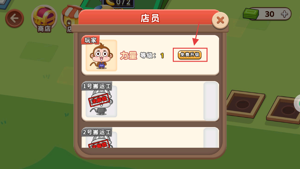 3、在【店员】界面点击【免费升级】,提升角色【力量】等级增强超市经营中的工作能力。