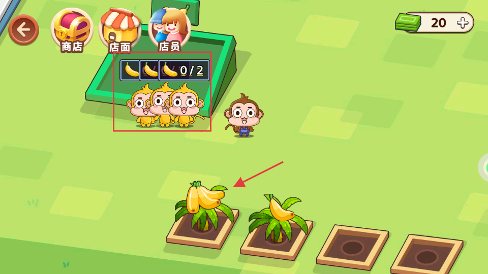 4、让黄色小猴子去香蕉种植区采集香蕉,满足【0/2】的任务需求推进超市货物储备进度。