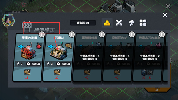 4、进入【建造模式】,选择建造果实收割机、石磨坊等建筑,提升资源获取和加工能力。