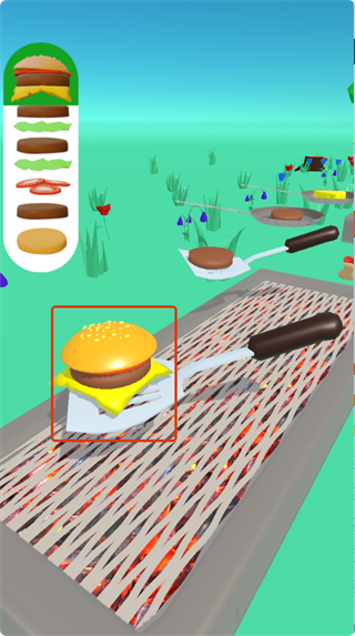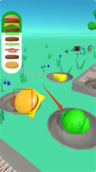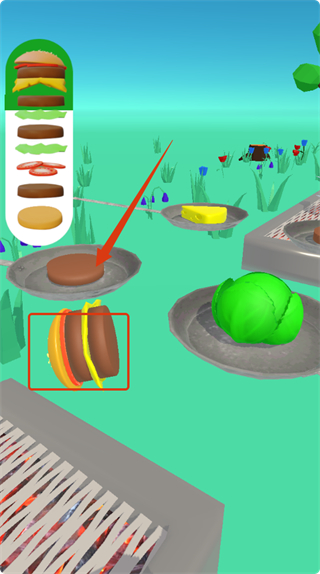 1、观察左侧汉堡配方,按顺序收集食材,在烤架上组合汉堡,确保每一层都对应配方。