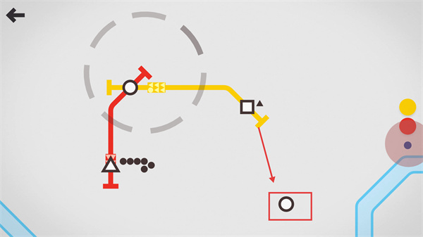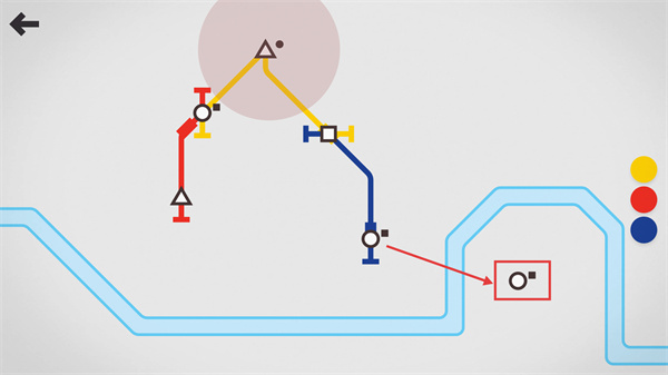 4、调整蓝色轨道旁的【圆形按钮】,修正轨道走向,使各颜色轨道最终汇入对应区域,完成关卡线路布局。