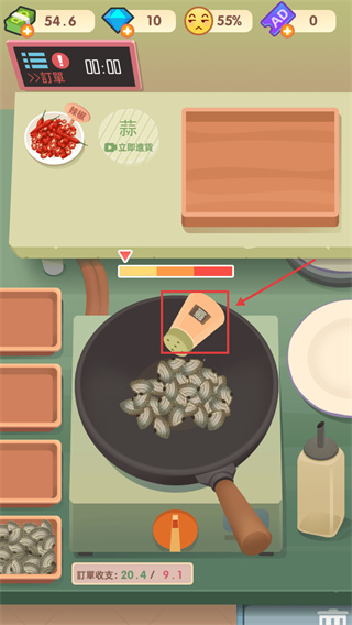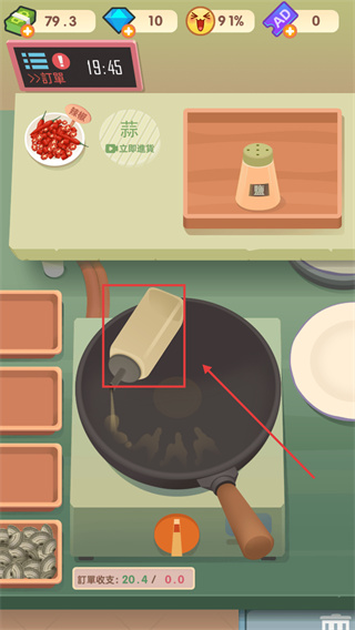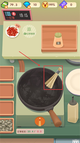 1、先操作【锅刷】清理炒锅,同时留意【訂單】-19:15的倒计时,若【蒜】不足可点击【立即补貨】补充食材。