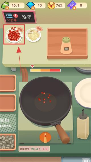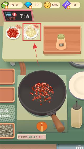 3、加入【辣椒】后,需补充【蒜蓉】到炒锅中,保持食材搭配的合理性,同时留意【訂單】-21:15的剩余时间。