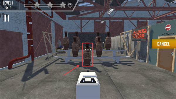 2、进入【LEVEL-1】后,瞄准红框内的陶罐目标,精准射击完成该关卡的破坏任务,注意把控射击角度。