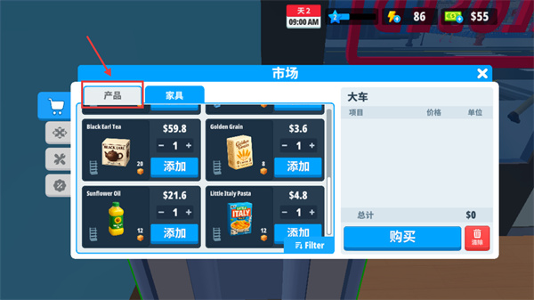1、在【市场】的“产品”标签页选择商品,点击“添加”后再点“购买”完成采购;需根据当前资金合理规划采购,避免出现现金不足的情况。