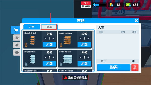 2、切换至“家具”标签页可采购货架类道具,用于扩展商品陈列空间;建议先积累经营收益,再逐步升级货架提升店铺容量。