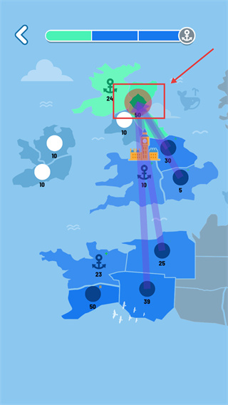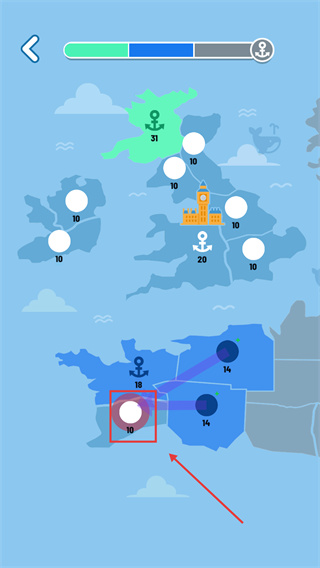2、在地图界面优先选择数值为【10】的区域进行占领,通过连线扩展己方控制范围,逐步提升区域占比。
