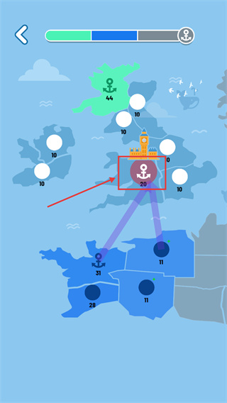 3、将己方【20】数值的锚点区域与其他区域连线,扩大控制范围的同时,提升对应区域的数值强度。